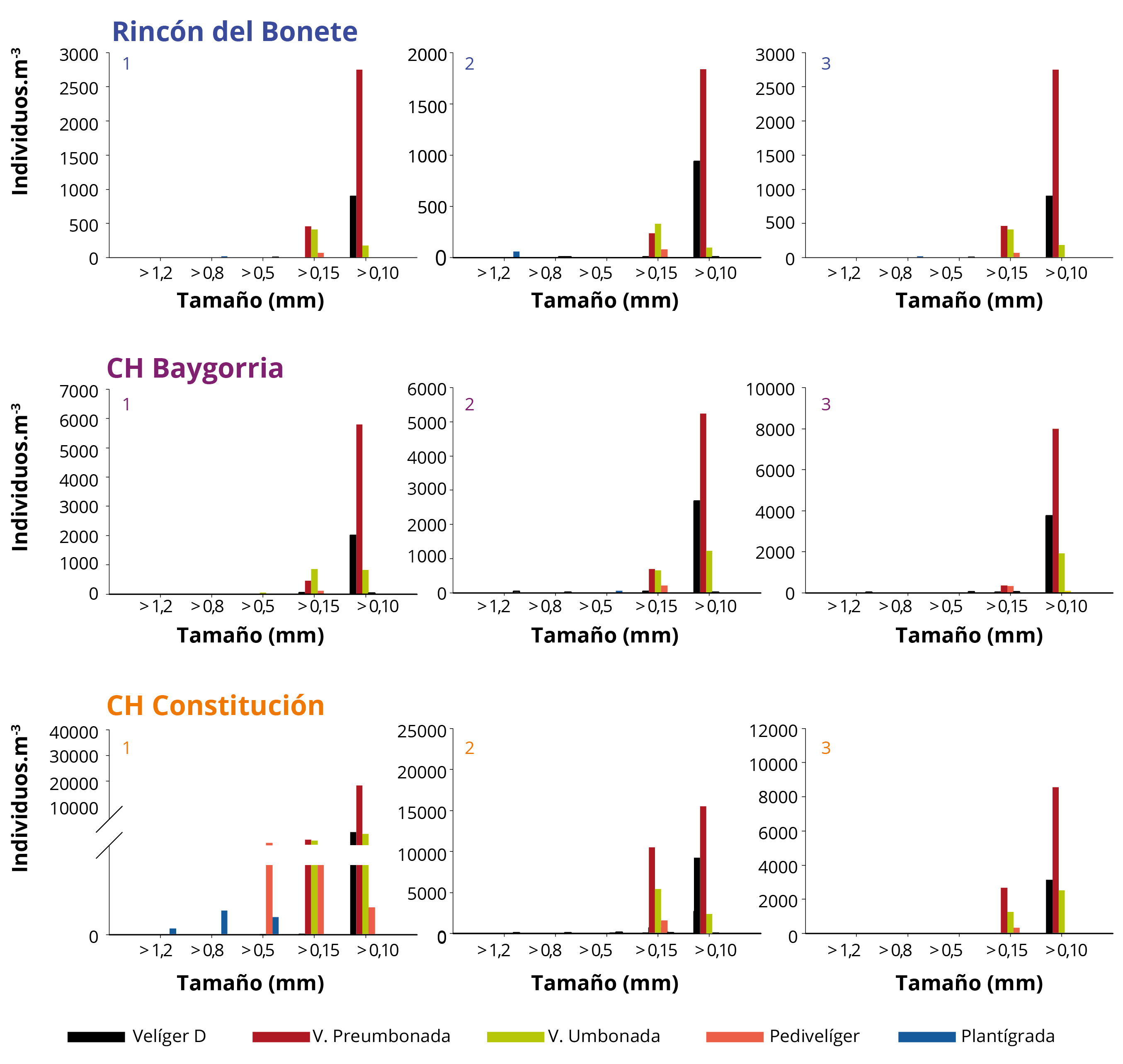 El tamaño dominante de larvas correspondió a organismos mayores a 100μm, seguido de mayores a 150μm. Los restantes tamaños (500, 800 y 1200μm) presentaron baja representación (Figura 6). El estadio de Velíger umbonada, Pedevelíger y Plantígrada (o Post-larvas) (tamaños que aproximadamente oscilan entre 200 y 800μm) ocurrieron pocas veces y en pocos lugares (Figura 6). Sin embargo, en CH Constitución se registró una mayor cantidad de Plantígrada o Post-larva, principalmente en el sitio 1.