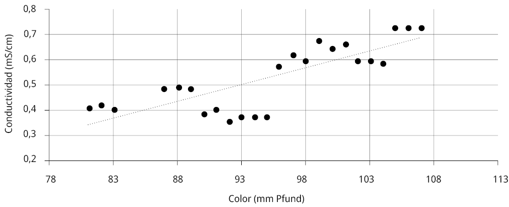 Los parámetros de color y conductividad eléctrica se asocian al contenido de minerales presentes en las mieles. En la Figura 3 se observa una relación lineal positiva entre ambos, con un coeficiente de correlación R2 de 0,65.