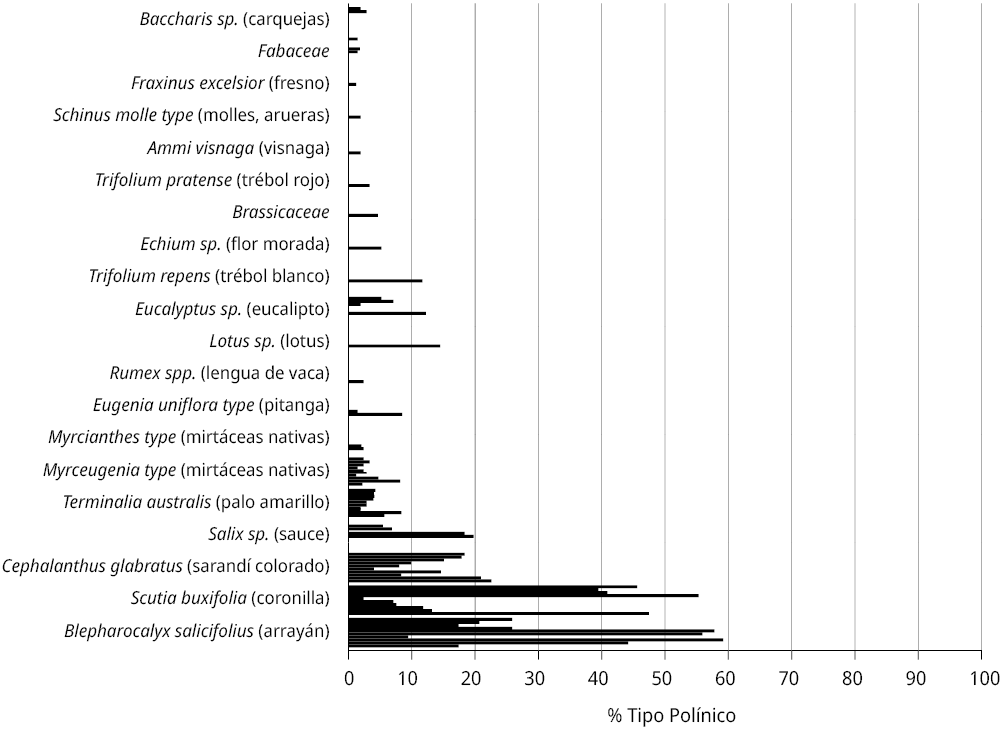 Los análisis melisopalinológicos, realizados para determinar el origen botánico de las muestras, tienen como base fundamental el reconocimiento de los gránulos de polen presentes naturalmente en una miel. El conocimiento del origen botánico de las mieles es muy importante desde el punto de vista del productor. Si bien puede significar un trabajo extra en el manejo de la producción, abre una nueva posibilidad comercial ya que le otorga un valor agregado al producto para la venta. Como resultado de los estudios llevados a cabo, se pudo observar que las mieles presentaron un espectro polínico generalmente variado; con un número de tipos polínicos identificados que varió entre 23 y 40, teniendo en general una alta proporción de especies autóctonas (Figura 4). Es importante subrayar que estas mieles se caracterizaron por una riqueza polínica alta. Un 60% de las muestras resultaron ser monoflorales de las especies nativas Blepharocalyx salicifolius y Scutia buxifolia, y varias más estuvieron muy cerca de serlo (Tabla 2), lo cual podría alcanzarse con un protocolo de producción adecuado. El grupo de mieles analizadas presentaron en general una alta proporción de mirtáceas nativas, que en conjunto alcanzaron valores entre el 20% y 60% del total de granos de polen del espectro. Las plantas nativas en general estuvieron representadas en valores mayores al 72% en el espectro polínico. El uso de montes nativos para la producción de miel es de especial interés ya que, además de las características particulares de la flora, se trata de lugares libres de pesticidas (Daners y Tellería, 1998). En las áreas ubicadas alrededor del bosque ribereño es posible producir mieles monoflorales de Scutia buxifolia (Daners y Campá, 1996) y Blepharocalyx salicifolius.