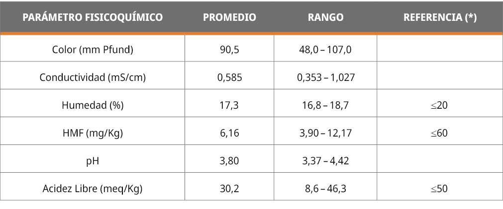 Las muestras fueron analizadas para determinar los siguientes parámetros fisicoquímicos: pH, contenido de agua (humedad), hidroximetilfurfural (HMF), acidez libre, conductividad eléctrica y color.