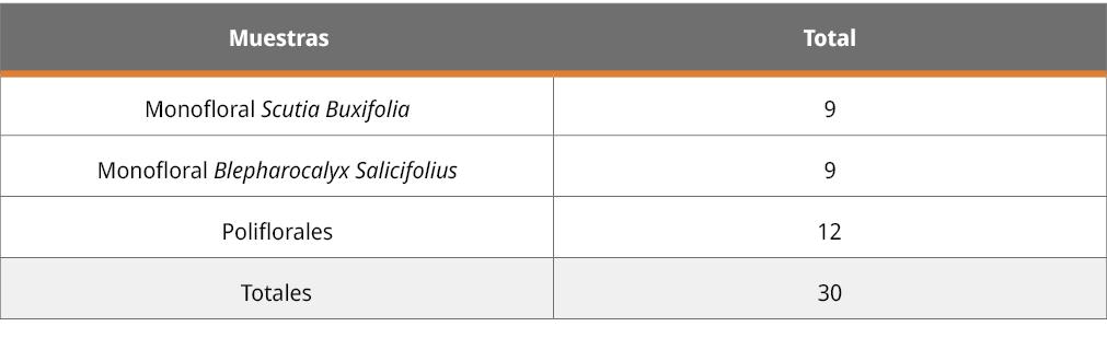 Se estudiaron 30 muestras de mieles provenientes de apiarios de Estero de Farrapos e Islas del Río Uruguay. Las mismas corresponden a la cosecha de verano (diciembre) de 2019, y fueron tomadas por los apicultores siguiendo un protocolo con criterios preestablecidos especialmente, donde los panales cosechados fueron extraídos en salas de extracción habilitadas por el Ministerio de Ganadería, Agricultura y Pesca (MGAP), evitando la mezcla con mieles provenientes de otras locaciones.