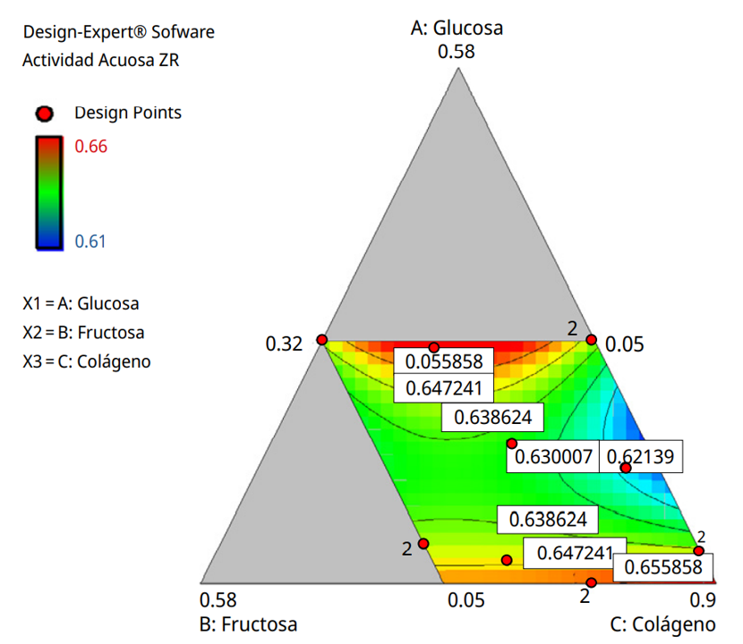 En la Figura 1 se observa la variación de la actividad acuosa para las diferentes formulaciones, donde se representa con rojo el valor más elevado obtenido, de 0,66; y el menor de 0,61 en azul, indicando los valores intermedios en color amarillo y verde. Se detectan los mayores valores de actividad acuosa (0,66) para aquellas formulaciones con elevado porcentaje de colágeno (77,2%) y bajo porcentaje de glucosa (5%); no existe una clara correlación con respecto al porcentaje de fructosa.