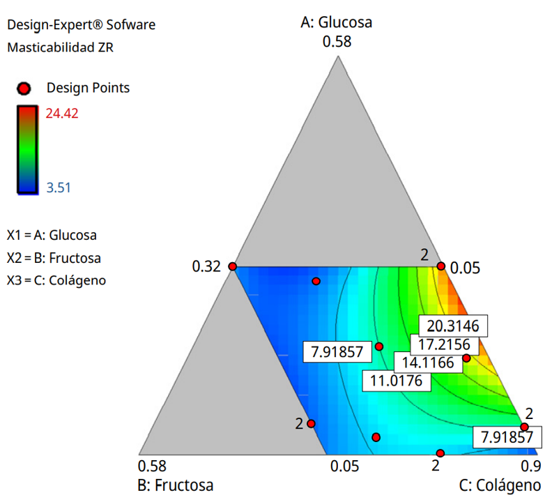En la Figura 2 se representa la variación del parámetro textural de masticabilidad con respecto a la composición del aglutinante. En rojo se muestra el valor más elevado para esta variable, de 24,42 mJ; en amarillo y verde se sitúan las formulaciones intermedias y en azul se encuentra el valor más bajo de masticabilidad, de 3,51 mJ. Las formulaciones de masticabilidad más alta corresponden a aquellas con elevado porcentaje de colágeno y glucosa, y bajo porcentaje de fructosa; mientras que el parámetro de masticabilidad tiende a alcanzar sus valores más bajos para los bocaditos con menor porcentaje de colágeno y mayor porcentaje de fructosa.