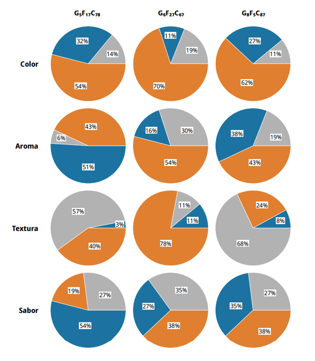 Comparando los valores ideales que están representados por el color naranja en la Figura 3, observamos que el bocadito G6F27C67 presentó valores mayores a los de las otras formulaciones en color, aroma y textura. Mientras que en sabor presentó valores semejantes a los de G8F5C87 y mayores que G5F17C78. A partir de estos resultados es posible inferir que el bocadito G6F27C67 fue el que presentó la mejor performance, fundamentalmente por la puntuación que ha recibido en cuanto a textura.