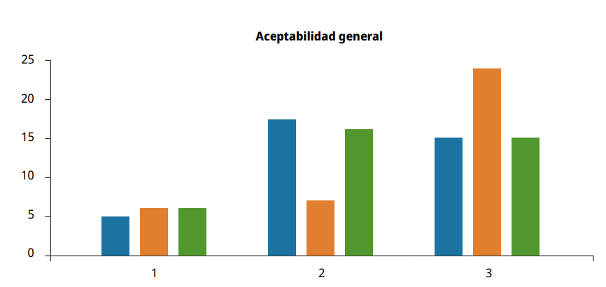 Figura 4. Histograma de aceptación general de los bocaditos G5F17C78 (celeste), G6F27C67 (naranja) y G8F5C87 (verde).