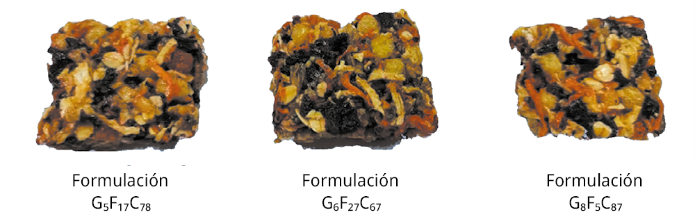 Los resultados de la formulación se expresan como porcentaje de fructosa, glucosa y colágeno dentro del aglutinante, ya que el resto de los ingredientes permanecen constantes y se indican como GaFbCc, donde G, F y C refieren a glucosa, fructosa y colágeno, respectivamente, y los subíndices a los porcentajes obtenidos a partir de la optimización del diseño. Surgieron 3 bocaditos: G8F5C87, G6F27C67 y G5F18C77 (Tabla 2).