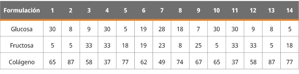 El diseño se preparó modificando la cantidad de glucosa, fructosa y colágeno —y manteniendo constante el resto de los ingredientes— mediante el software Design Expert 7.0.0 (State-Ease Inc., 1988). El sistema operó con las siguientes restricciones: glucosa 0,05-0,03; fructosa 0,05-0,033 y colágeno 0,37-0,9. Se obtuvieron como respuesta 14 formulaciones (cinco fueron repeticiones) con diferentes cantidades de cada componente, las que se indican a continuación: