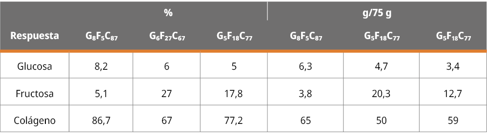 Los resultados del diseño experimental se expresarán mediante la sigla GgFbCc, correspondiendo cada letra a glucosa, fructosa y colágeno, respectivamente, y los subíndices a los valores encontrados desde la respuesta del diseño experimental.