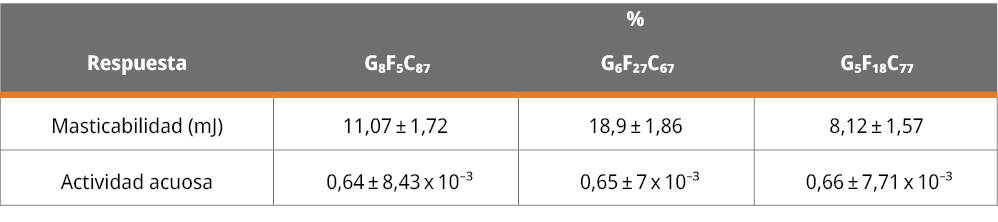 En la Tabla 3 se muestran los valores estimados por el software Design Expert 7.0.0 (Stat-Ease Inc., 1988) para masticabilidad y actividad acuosa de las muestras seleccionadas a partir de la optimización del diseño experimental.