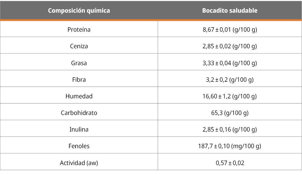 El tubérculo de topinambur tiene una humedad de 73,1 ± 1,5/100 g (Díaz, et al., 2019). Cuando la materia prima es superior a 60 g/100 g, se asocia con un alto costo de transporte y cortos periodos de vida útil. Dado que es muy beneficioso por su alto contenido de inulina, resulta adecuado transformarlo en chip para luego ser usado en la elaboración de harina u otros alimentos. Uno de los factores importantes desde el punto de vista nutricional es su contenido proteico: el valor hallado en el análisis porcentual del bocadito fue semejante y en algunos casos superior al de otros productos similares. El contenido graso fue bajo a pesar de que se usó maní, el cual posee un alto contenido de grasa. En el bocadito, los chips de topinambur corresponden a un 7,4% del total de los ingredientes. En estudios anteriores hemos encontrado valores promedios de inulina en topinambur seco del orden del 50%, por lo que deberíamos haber obtenido teóricamente 3,7 g% y hemos obtenido 2,85 g%, de tal modo que se encontró un 77% del valor esperado. El contenido total de fenoles fue de 187,7 ± 0,1 mg, equivalentes de ácido gálico/100 g muestra en base seca, correspondiéndole 47 mg por cada bocadito. Para productos alimenticios una aw >0,6 podría favorecer el crecimiento microbiano y afectar su estabilidad y conservación. La actividad de agua de las barras fue inferior a ese valor, lo cual es beneficioso ya que permite una conservación adecuada.