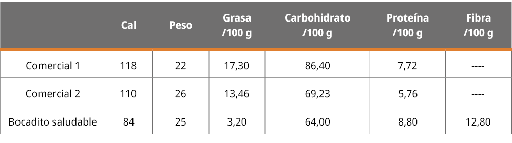 Tabla 5. Comparación de composición entre barras comerciales y el bocadito saludable elaborado en el laboratorio