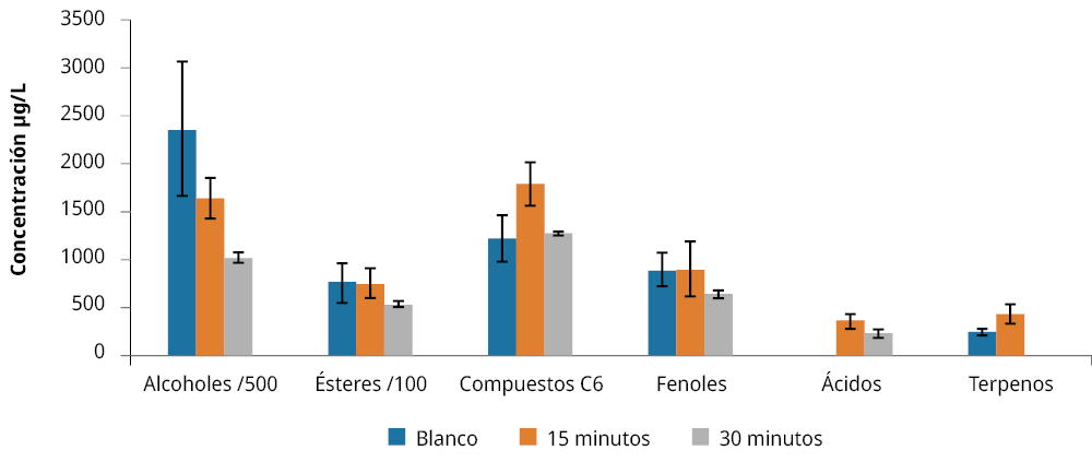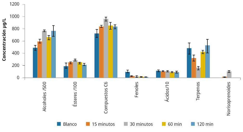 En la Figura 2 se muestra el comportamiento de los compuestos agrupados por familia: en el tratamiento de 30 minutos, alcoholes, ésteres y compuestos C6 aumentaron su concentración. Pero en otros casos fue evidente la degradación de componentes en cualquier tiempo de tratamiento con AP. El aumento de norisoprenoides a los 30 minutos se puede explicar por la presencia de 3 hidroxi-β-damascenona que fue determinada solo en ese tiempo de tratamiento de AP.