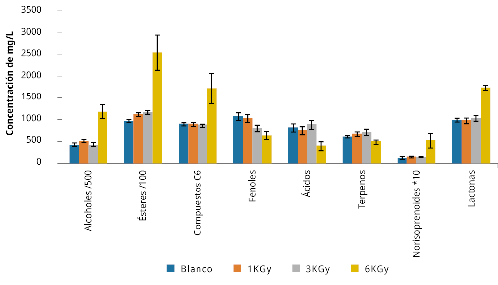 Figura 3. Efecto en la suma de componentes volátiles agrupados por familias en vinos Tannat irradiados con RG.