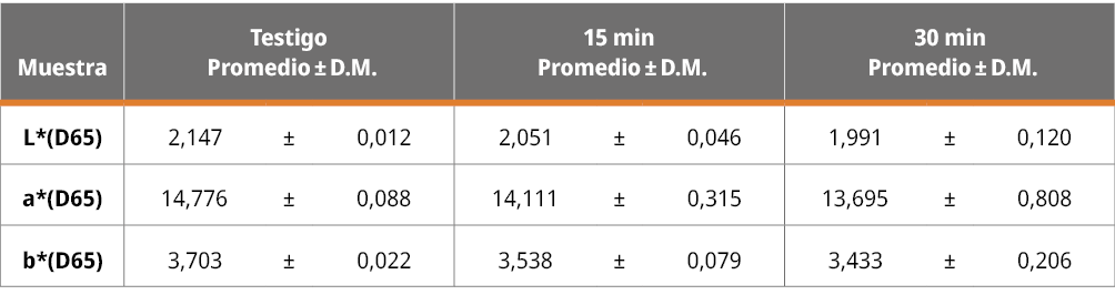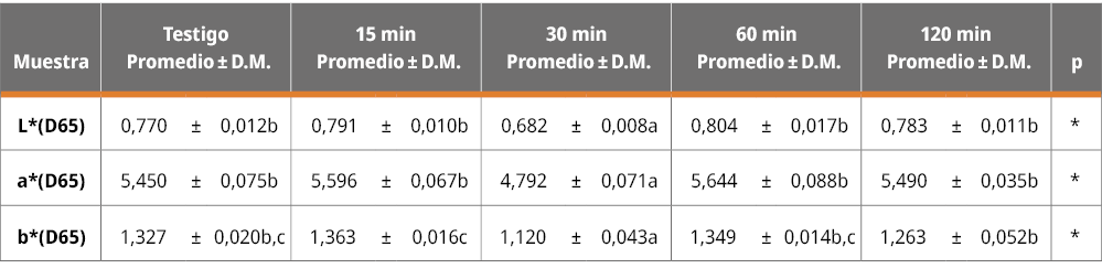 Para el tratamiento de altas presiones, solo los valores a los 30 minutos presentaron una disminución significativa respecto a los otros tiempos de tratamiento en todos los parámetros de color (Tabla 9). Durante un envejecimiento convencional se esperaría un aumento del parámetro b* (hacia amarillo) y del parámetro L*, lo cual no sucedió en las muestras tratadas con ultrasonido.