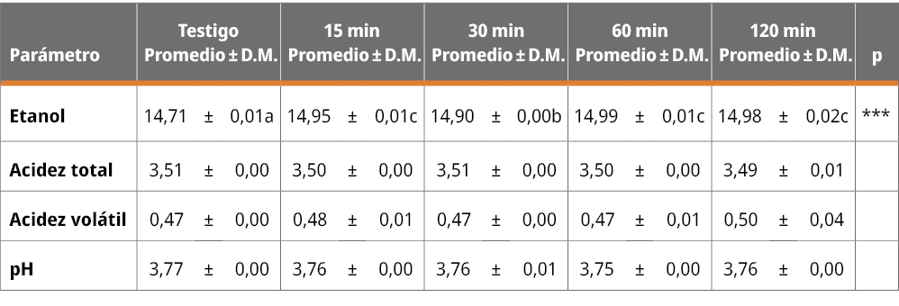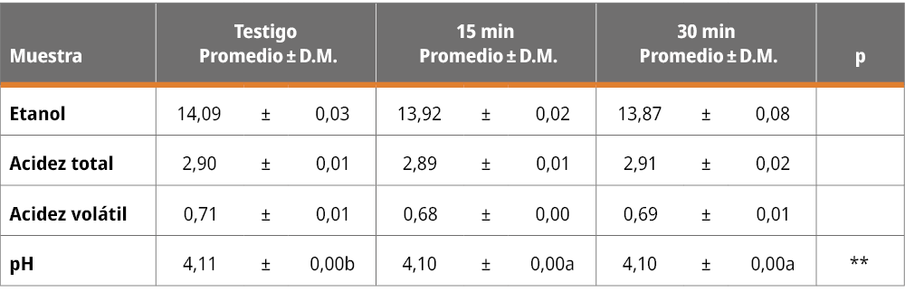 En el caso de los vinos sometidos a distintos tiempos de ultrasonido (Tabla 1), el único parámetro que presentó una variación significativa fue el pH, que disminuyó una centésima de unidad. No se registró una variación en el resto de los parámetros fisicoquímicos, lo cual concuerda con lo previamente reportado para vinos de arroz, maíz, uvas blancas y tintas sometidos a ultrasonido en iguales condiciones que las utilizadas en este trabajo (Chang, 2004; Chang y Chen, 2002; Cui, et al., 2012; García Martín y Sun, 2013).