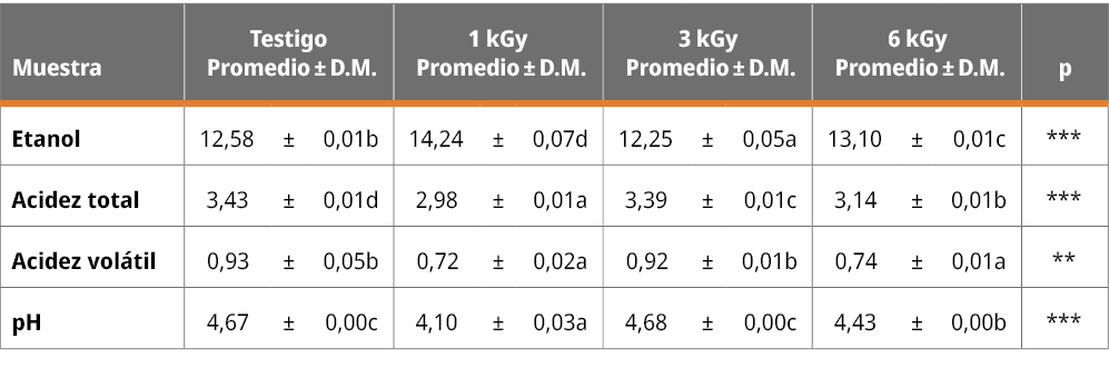 Los efectos del tratamiento de RG sobre vinos Tannat se observan en la Tabla 2. Para la mayoría de los resultados se encontraron diferencias significativas (p < 0,05) en los distintos parámetros. El etanol presentó un máximo de 1kGy, mientras que para acidez total y pH —a esa misma dosis de tratamiento— se obtuvieron los valores mínimos hallados en este estudio. En el caso del contenido de etanol, los resultados difieren de lo reportado por Harder y otros (2013), quienes no encontraron variaciones en este parámetro al utilizar las mismas condiciones experimentales. Los resultados de pH coinciden con los obtenidos por Harder y otros (2013) para dosis de 1KGy, donde se observa una disminución del pH al aumentar la dosis de radiación gamma. Sin embargo, en el trabajo de Harder y otros (2013) la disminución de pH fue constante con el aumento de la dosis, mientras que en nuestras condiciones el pH presentó oscilaciones al aumentar la dosis (Tabla 1).