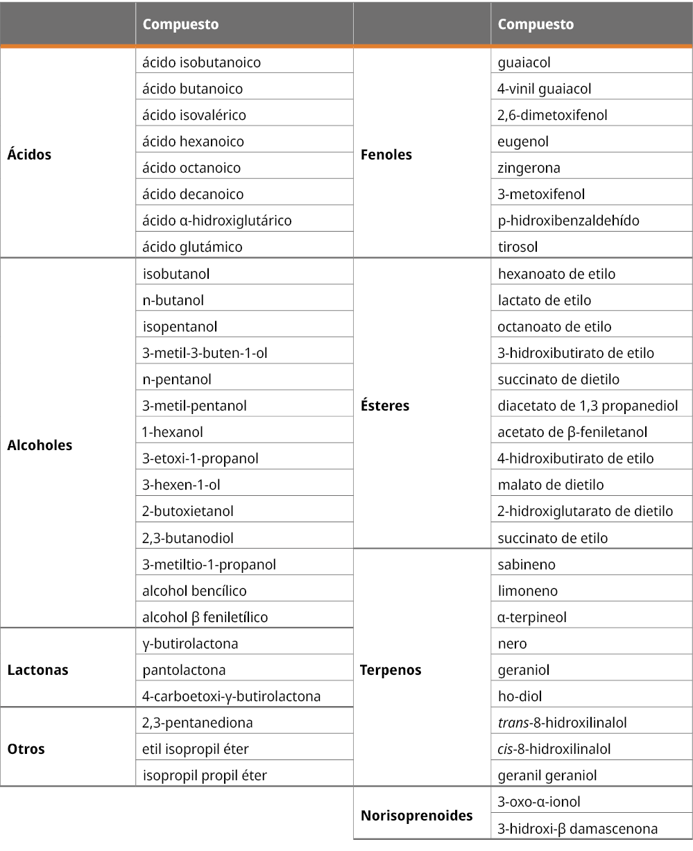 Mientras que los ácidos grasos de cadena corta (ácido isobutanoico, ácido hexanoico ácido octanoico y ácido decanoico) y fenoles volátiles (guaiacol, 4-vinil guaiacol, 2,6-dimetoxifenol, eugenol) disminuyeron significativamente su concentración al aumentar la dosis de RG aplicada.