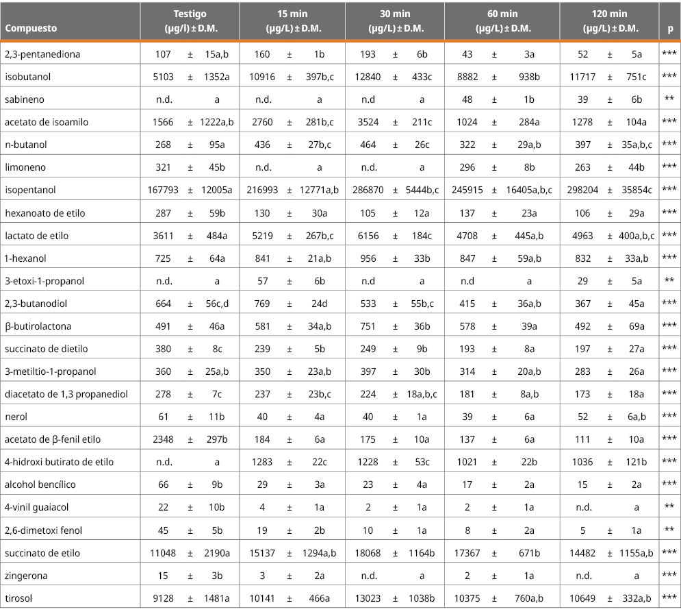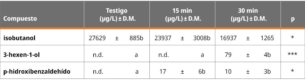 En la Tabla 5 se puede observar cómo el tratamiento de ultrasonido afectó a las muestras, generando nuevos compuestos que no fueron detectados inicialmente en la muestra testigo. El compuesto 3-hexen-1-ol y el p-hidroxi benzaldehído fueron generados durante los tratamientos de US. El 3-hexen-1-ol es un compuesto que, cuando se detecta en los vinos, se origina durante los tratamientos prefermentativos a partir de los ácidos grasos de la película de la uva. En el vino testigo no se detectó la presencia del 3-hexen-1-ol, por lo que se puede haber generado a partir de la oxidación de ácidos grasos presentes en el vino durante el tratamiento con ultrasonido. El p-hidroxi benzaldehído es otro compuesto producto de la oxidación pero en este caso se origina a partir de un precursor de origen fenólico. El isobutanol, en tanto, disminuyó al aumentar el tiempo de exposición a ultrasonido, acompañado por un aumento en la formación del acetato respectivo, el cual no es significativo.
