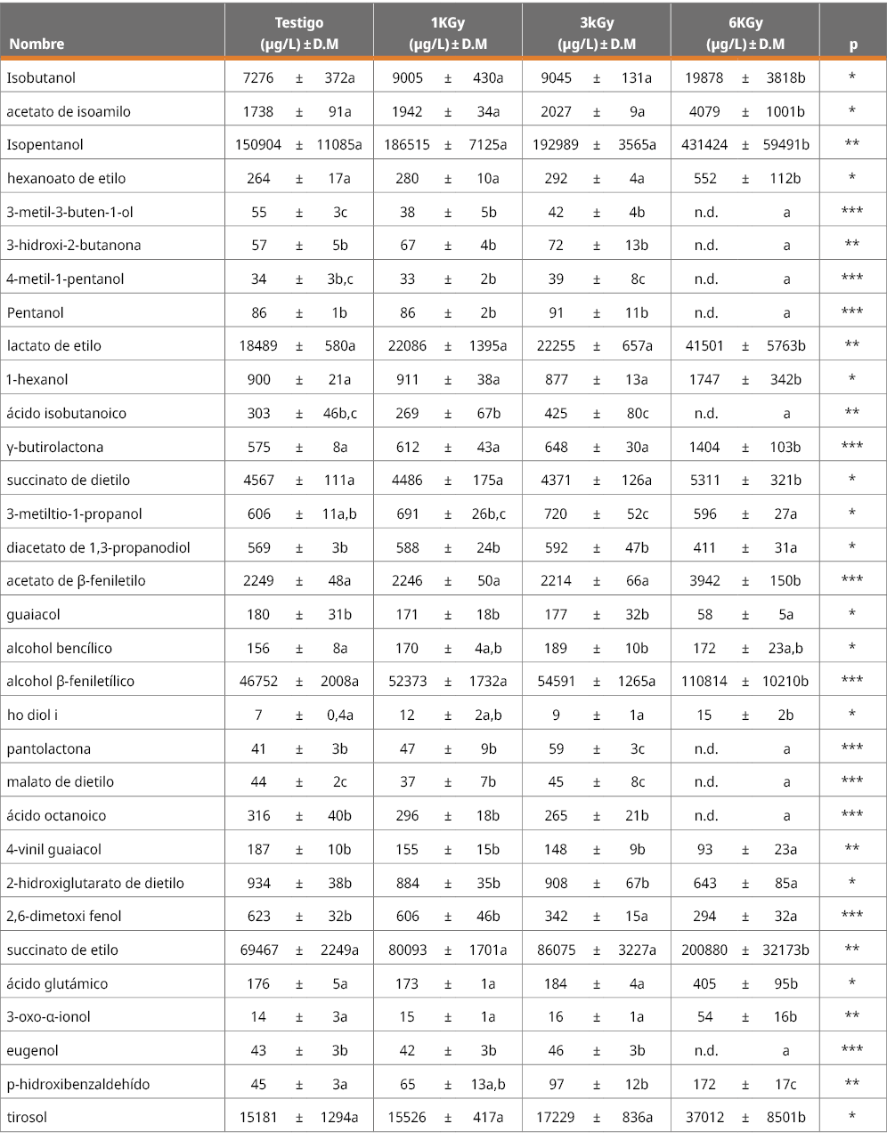 Tabla 7. Compuestos volátiles cuya concentración cambió en forma significativa durante los tratamientos de radiación gama en comparación con el vino testigo.