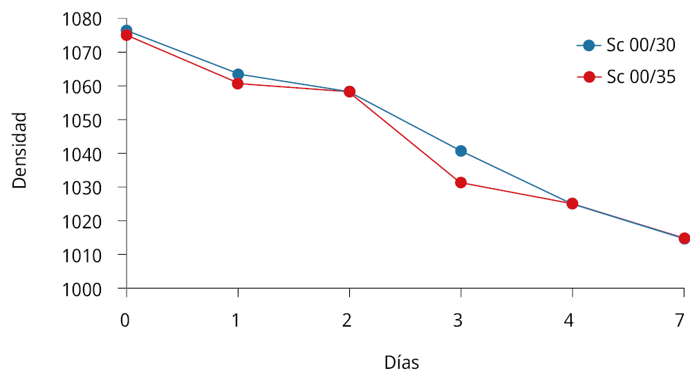 Los resultados correspondientes al seguimiento y a la evolución de la fermentación alcohólica se muestran en la Figura 1, donde se observa la disminución de la densidad del mosto conforme avanza la fermentación alcohólica. En la cepa Sc 00/30 se registró una disminución de la densidad similar a lo largo de los siete días. Sin embargo, el comportamiento de la cepa Sc 00/35 fue diferente, presentando una caída abrupta entre los días 2 y 3, pasando de un valor de 1058 a otro de 1031. El valor luego se mantuvo relativamente estable con una pequeña disminución a 1025 en el día 4, cuando continuó con igual comportamiento que la cepa Sc 00/30. Ambas fermentaciones comenzaron con una densidad inicial de 1075 y alcanzaron una densidad final de 1014,5 ± 0,5 en Sc 00/30 y de 1015 ± 1,0 en Sc 00/35. Esto representó una atenuación del 66% y 67% respectivamente.