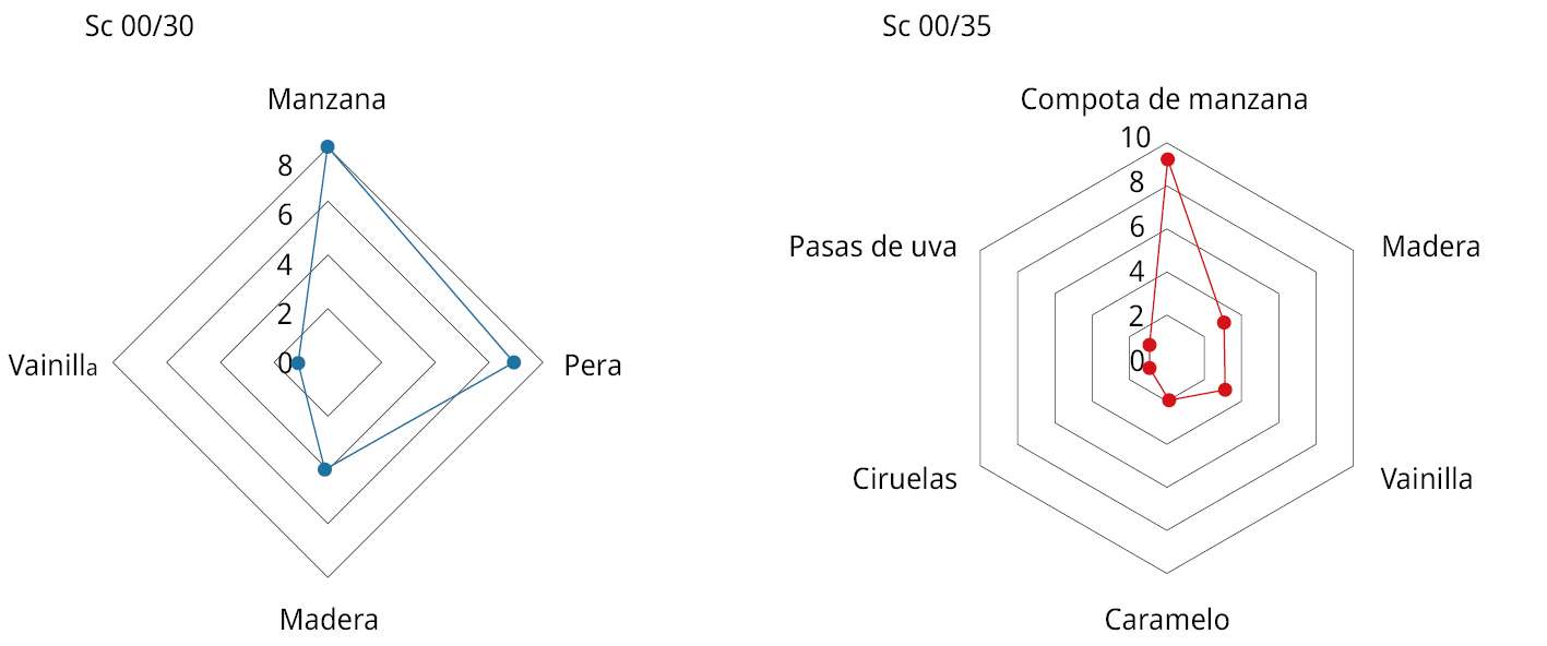 En lo que respecta a la evaluación sensorial (Figura 2), en ambas cepas se encontraron aromas frutales, destacándose en la cepa Sc 00/30 notas descriptivas de manzana y pera, y en Sc 00/35 compota de manzana. En ambos casos, los evaluadores detectaron descriptores como madera, vainilla y caramelo, los cuales seguramente provienen de las barricas de roble.