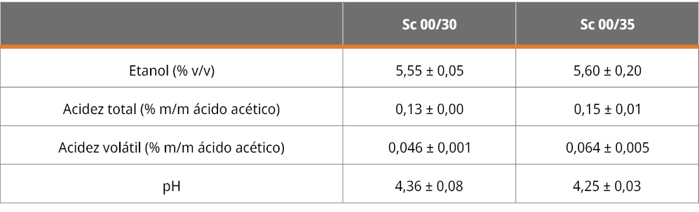 En cuanto a los datos fisicoquímicos básicos de control (Tabla 1), no se observó una diferencia significativa entre las cepas para ninguno de los parámetros estudiados. No obstante, la cerveza elaborada con la cepa Sc 00/35 presentó valores mayores de acidez, fundamentalmente en el parámetro de acidez volátil, lo que también se vio reflejado en una disminución del pH comparativamente con la cepa Sc 00/30.