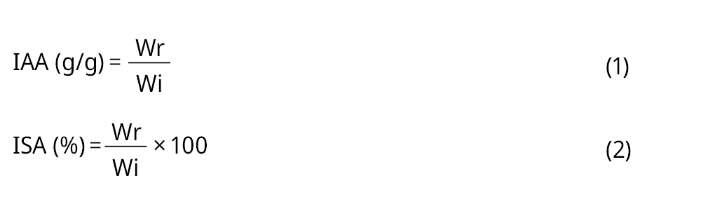 Se determinaron por el método de Anderson y otros (1969). Se pesaron 2,5 g de cada muestra en tubos de centrífuga. Luego se adicionaron 30 mL de agua destilada y se colocaron en baño termostático a 30 ℃ por 15 min con agitación, se enfriaron a temperatura ambiente y se centrifugaron a 3000 rpm por 10 min. Se registraron los pesos de los residuos o geles obtenidos en los tubos de centrífuga. Los sobrenadantes obtenidos se colocaron en cajas de Petri y se evaporaron a 110 ℃ para determinar los sólidos solubles. Los IAA e ISA se calcularon según las ecuaciones: