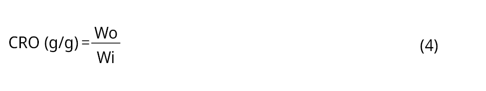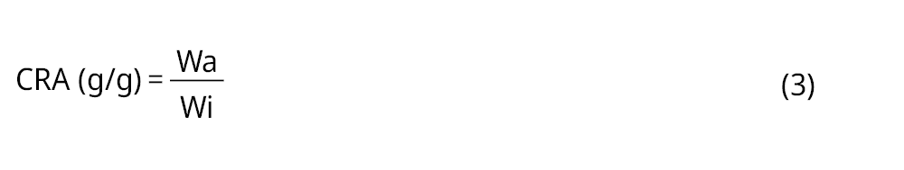 La capacidad de retención de agua se determinó pesando 1 g de cada muestra seca. Las muestras se hidrataron con 30 mL de agua destilada en tubos de centrífuga y se dejaron en reposo a 20 ℃. Después de 18 h, se centrifugaron a 3000 g durante 20 min. Luego se decantó el sobrenadante y se pesó el residuo. La CRA de las muestras se determinó con la siguiente ecuación: