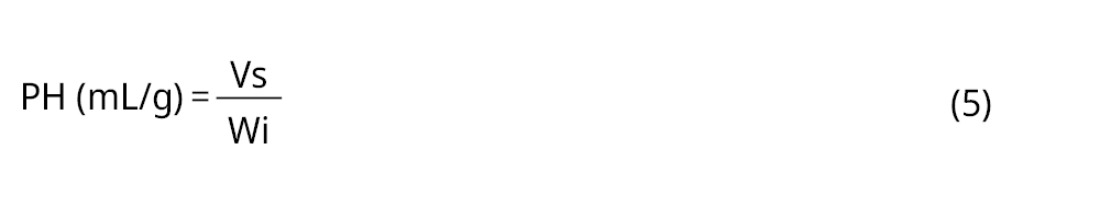 Para la determinación del poder de hinchamiento se pesaron 200 mg de cada muestra en una probeta graduada y se hidrató con 10 mL de agua destilada a 20 ℃ durante 18 h, finalmente se registró el volumen ocupado por la muestra. El PH se determinó con la siguiente ecuación: