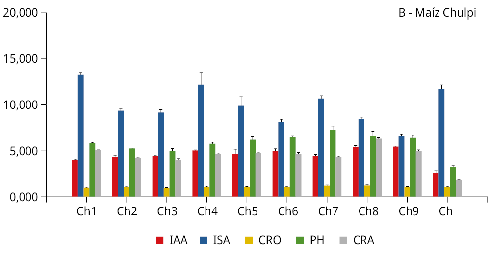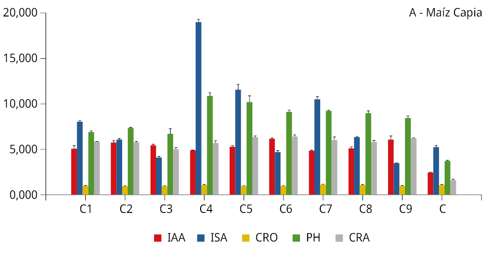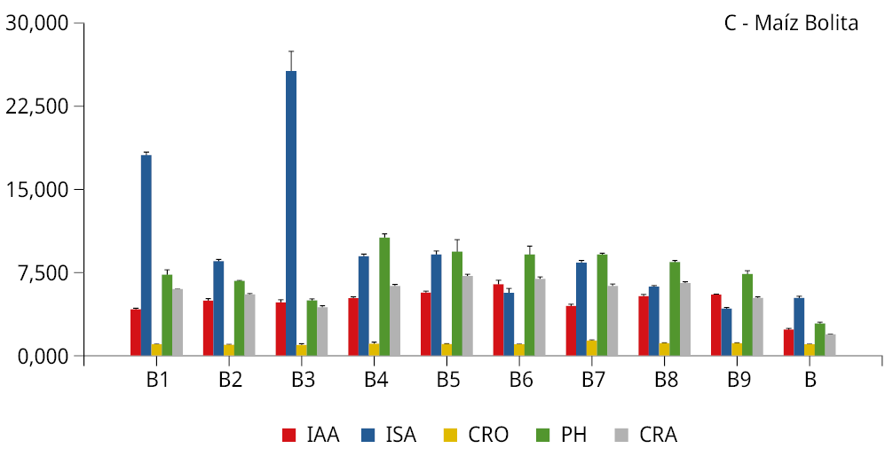 En general, las muestras de maíz Capia y Bolita tuvieron un comportamiento similar frente a la extrusión, presentando mayores IAA, CRA y PH a altas humedades y temperaturas. La similitud de la composición de las muestras nativas de maíz Capia y Bolita podrían explicar en parte estos resultados.