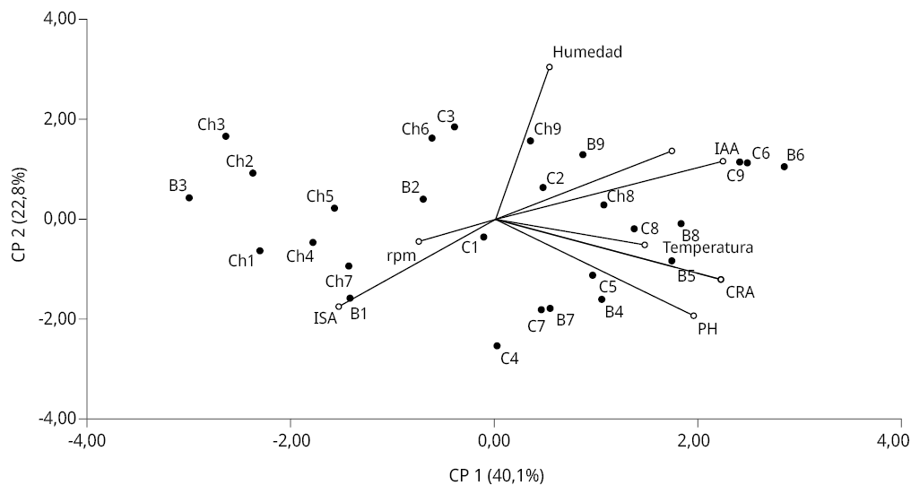 Se realizó un análisis de componentes principales con las propiedades tecnofuncionales que presentaron diferencias significativas para observar su correlación con las variables de extrusión y la diferenciación por raza de maíz (Figura 2). En el ACP se observó que los componentes 1 (CP1) y 2 (CP2) explicaron el 62,9% de la variabilidad de los datos. La temperatura tuvo mayor influencia en CP1 y la humedad en CP2.