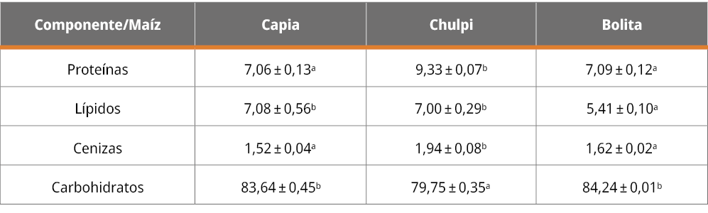 La composición proximal de las harinas integrales de maíces andinos se muestra en la Tabla 1, donde se observa que presentaron diferencias significativas en su composición. El maíz Chulpi presentó el menor contenido de carbohidratos y el mayor contenido de proteínas y cenizas. En tanto, el maíz Bolita presentó el menor contenido de lípidos. Los maíces Capia y Bolita presentaron composiciones similares, a excepción del contenido de lípidos, que fue significativamente distinto. Salvador-Reyes y Clerici (2020) señalaron que el contenido de proteínas suele ser superior en las razas de maíces andinos comparadas con el de maíz amarillo comercial. El contenido de grasa de las razas de maíz andino peruano mencionado por estos autores es casi la mitad comparado con los valores obtenidos en este trabajo. Esto podría afectar la tecnofuncionalidad de las harinas tratadas por extrusión, ya que estos lípidos pueden interactuar con la amilosa para formar complejos (Ding, et al., 2005).