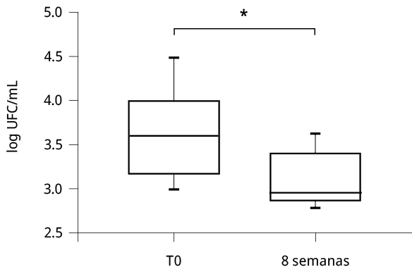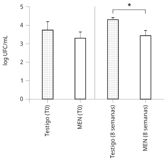 Figura 2. Abundancia de coliformes fecales (UFC/mL) registrada al inicio (T0) y al final (8 semanas) del tratamiento con MEN en los pozos sépticos (N = 9). El asterisco indica diferencias significativas entre ambos tiempos (MW, p = 0,04).