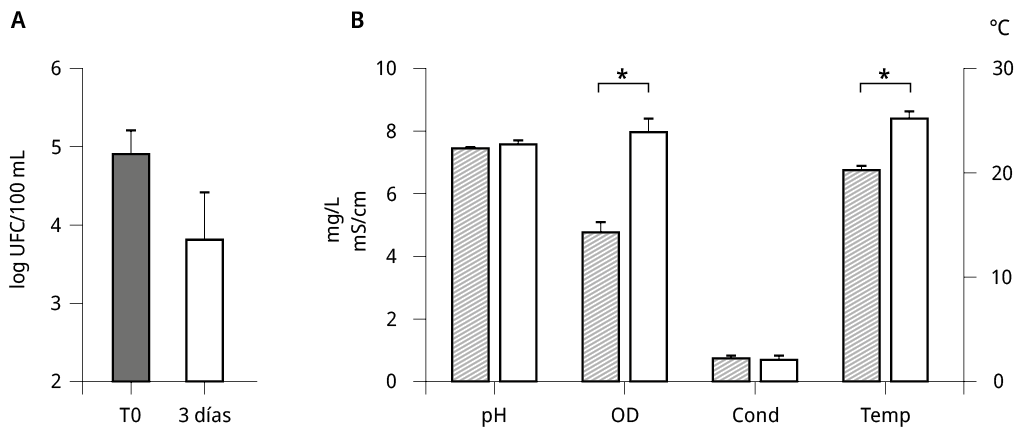 Inmediatamente después de la aplicación (T0) se tomaron 5 muestras de agua en el tramo de 30 m (cada 6 m) para determinar la abundancia de CF (American Public Health Association y American Water Works Association and Water Environment Federation, 2012) y de Lactobacillus spp. en la columna de agua. Se registró la conductividad, la temperatura, el oxígeno disuelto y el pH del agua con una sonda multiparamétrica portátil (Horiba U-52) y sus características organolépticas como el color y el olor. A los 3 días se tomaron muestras en los mismos sitios que a T0 y se registraron las mismas variables. Todas las determinaciones de abundancia de CF se realizaron al menos por triplicado para cada muestra obtenida (réplicas técnicas).