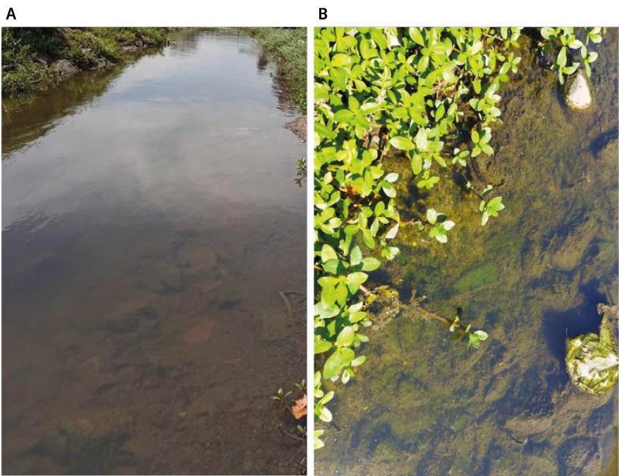 Figura 5. Características visuales del tramo del arroyo Malvín en el que se aplicó la solución de MEN. A) antes (T0) y 3 días después (B) de la aplicación de MEN. Se muestra el aumento de transparencia y penetración de la luz en la fotografía B), con crecimiento de algas bentónicas.