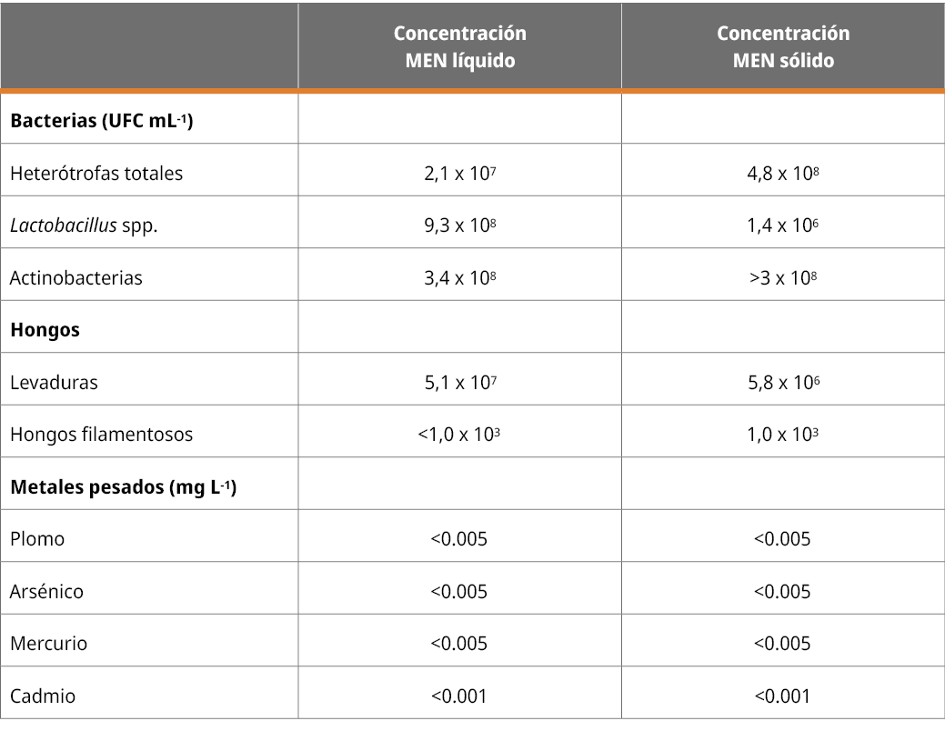 Tabla 1. Resultado del análisis de composición y calidad del preparado líquido y sólido de MEN.