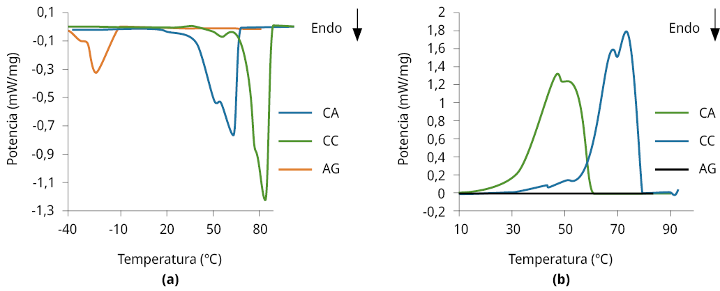 Figura 1. Termogramas de fusión (a) y cristalización (b) para CA, CC y AG.Termogramas de fusión (a) y cristalización (b) para CA, CC y AG.