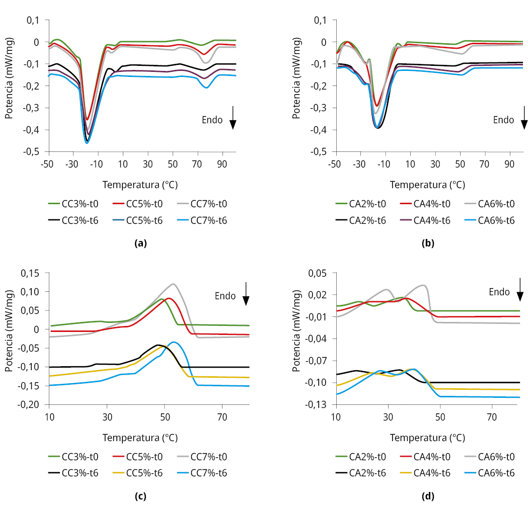 La Figura 2 muestra los termogramas de fusión y cristalización de los oleogeles estructurados con CA y CC a las concentraciones de 2.0, 4.0 y 6.0 %, y 3.0, 5.0 y 7.0 %, respectivamente, a tiempo inicial (t0) y luego de 6 meses (t6) de almacenamiento a 20 ℃.