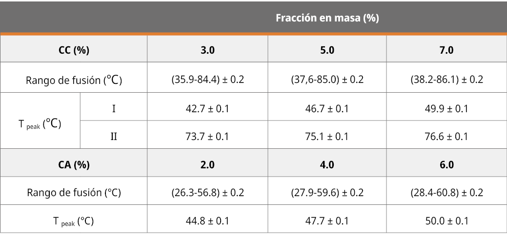 Tabla 2. Temperatura de pico y rangos de desestructuración para los oleogeles de AG formados con CC y CA a tiempo 0.