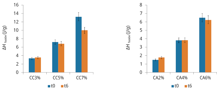 A su vez, se observó que los rangos de temperatura para la desestructuración de los oleogeles no se vieron afectados apreciablemente luego de transcurridos los 6 meses de almacenamiento (Figura 2a y b). La Figura 3 muestra las entalpías de fusión para los oleogeles de AG estructurados con CA y CC a tiempo inicial y a los 6 meses de almacenamiento. Se comprobó que la entalpía de fusión para los oleogeles a lo largo del tiempo no se vio drásticamente modificada en la mayoría de los casos. Solo el oleogel estructurado con CC al 7.0 % presentó una disminución importante en la entalpía de fusión. Este resultado evidencia que existe un marcado cambio en la estructura del oleogel que podría deberse a un incremento en su deterioro oxidativo (Hwang, 2020).