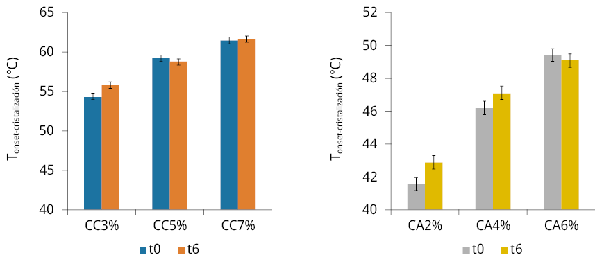 Figura 4. Temperaturas onset para la cristalización de los oleogeles estructurados con CA y CC a tiempo 0 y 6 meses.