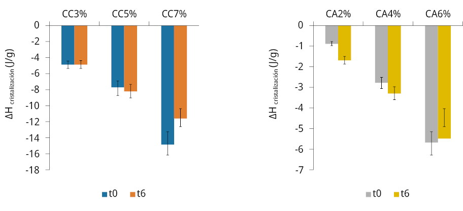 Figura 5. Entalpías de cristalización de los oleogeles estructurados con CA y CC a tiempo 0 y 6 meses.