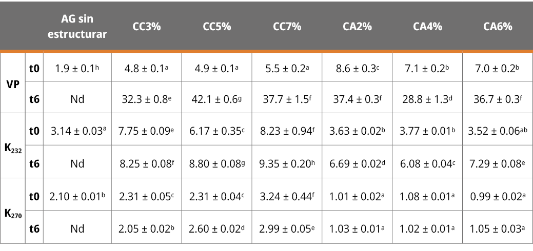 El VP es una medida del contenido de hidroperóxidos totales presentes en la muestra. La absorbancia a 232 nm (K232) determina fundamentalmente la presencia de hidroperóxidos del ácido linoleico (dienos conjugados). La absorbancia a 270 nm (K270) determina la presencia de productos obtenidos de la oxidación secundaria y de trienos conjugados presentes en aceites refinados. De acuerdo con la Tabla 3, los oleogeles estructurados con CA presentaron valores de VP significativamente superiores a los de CC a t0, y a su vez al del aceite sin estructurar. Ello indica que los oleogeles presentaron mayor grado de deterioro oxidativo como consecuencia de su proceso de obtención.