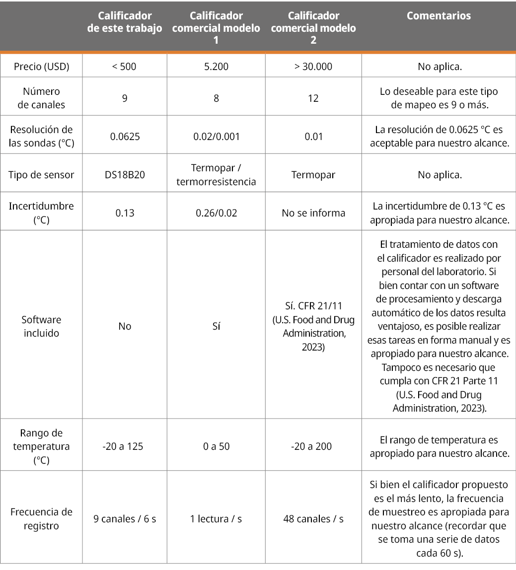 Tabla 1. Evaluación de dos opciones comerciales cableadas en comparación con el calificador propuesto en este trabajo.