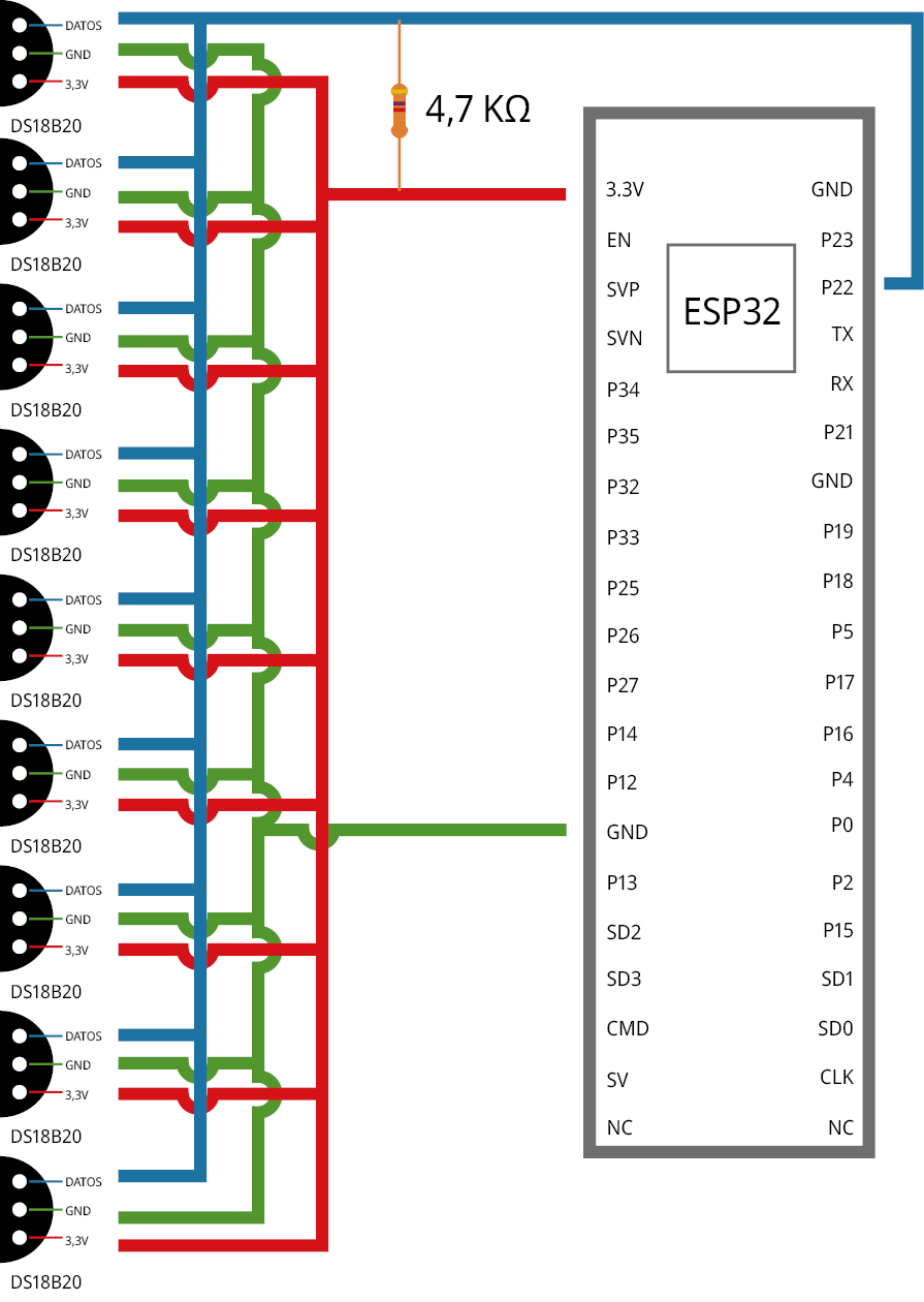 Figura 2. Conexiones eléctricas entre los sensores DS18B20 y la placa ESP32.