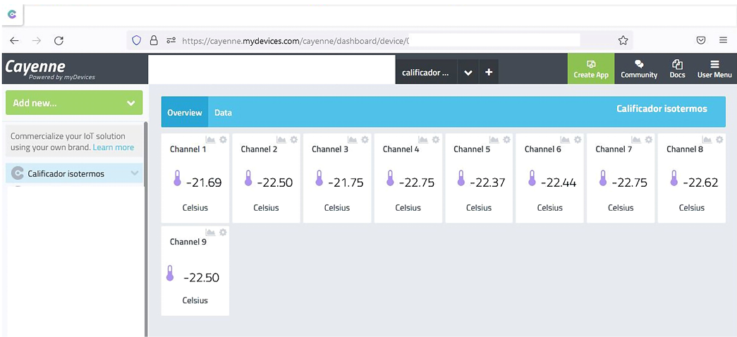 En la metodología diseñada, la herramienta de programación visual Node-RED (OpenJS Foundation & Contributors, 2012) (Figura 4), a través del nodo mqtt in, toma los 9 valores de temperatura y los envía por separado a un dashboard gratuito (Cayenne) utilizando el nodo cayenne sensor. El dashboard puede observarse en cualquier navegador web (Figura 5). Al mismo tiempo, se utiliza el nodo join para combinar los múltiples mensajes que llegan desde cada sensor en un único mensaje que contiene la fecha y hora junto a los valores de cada sensor. Así, el mensaje con las temperaturas y el tiempo puede almacenarse en la base de datos a través de una función y el nodo sqlite. Los valores almacenados en la base de datos pueden ser descargados en múltiples formatos (por ejemplo, csv) y pueden importarse con MS Excel. Con la hoja de cálculo se realizó el tratamiento estadístico y el cálculo de incertidumbres para informar los resultados.