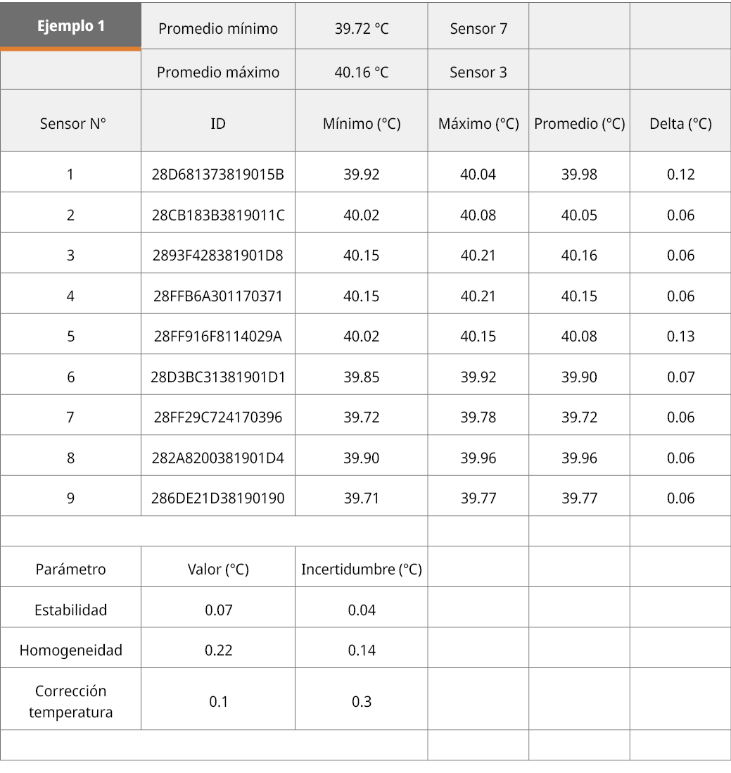 Para evaluar el desempeño en campo, en la Tabla 3 se adjuntan algunos ejemplos representativos de diferentes caracterizaciones llevadas a cabo. El ejemplo 1 corresponde a una cámara climática de punto consigna 40.0 ℃. El ejemplo 2 corresponde a otra cámara climática, esta vez fijada a 25.0 ℃. El ejemplo 3, a un horno operando a 105.0 ℃. El ejemplo 4, a un refrigerador cuya temperatura consigna es de 5 ℃. Los 4 ejemplos cubren un amplio rango de temperaturas y modos de funcionamiento (calefacción y refrigeración), lo cual permite apreciar la versatilidad del calificador y su comportamiento en el rango.