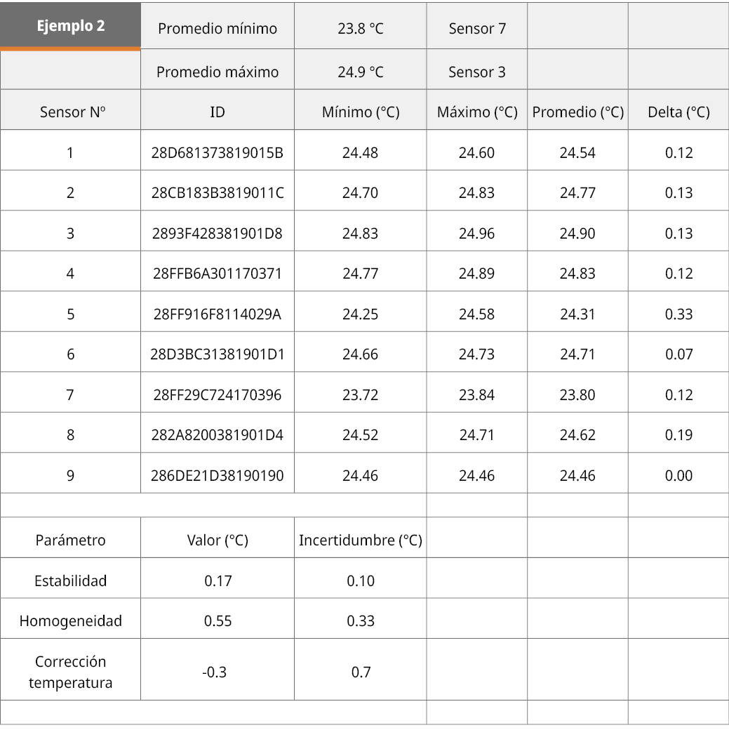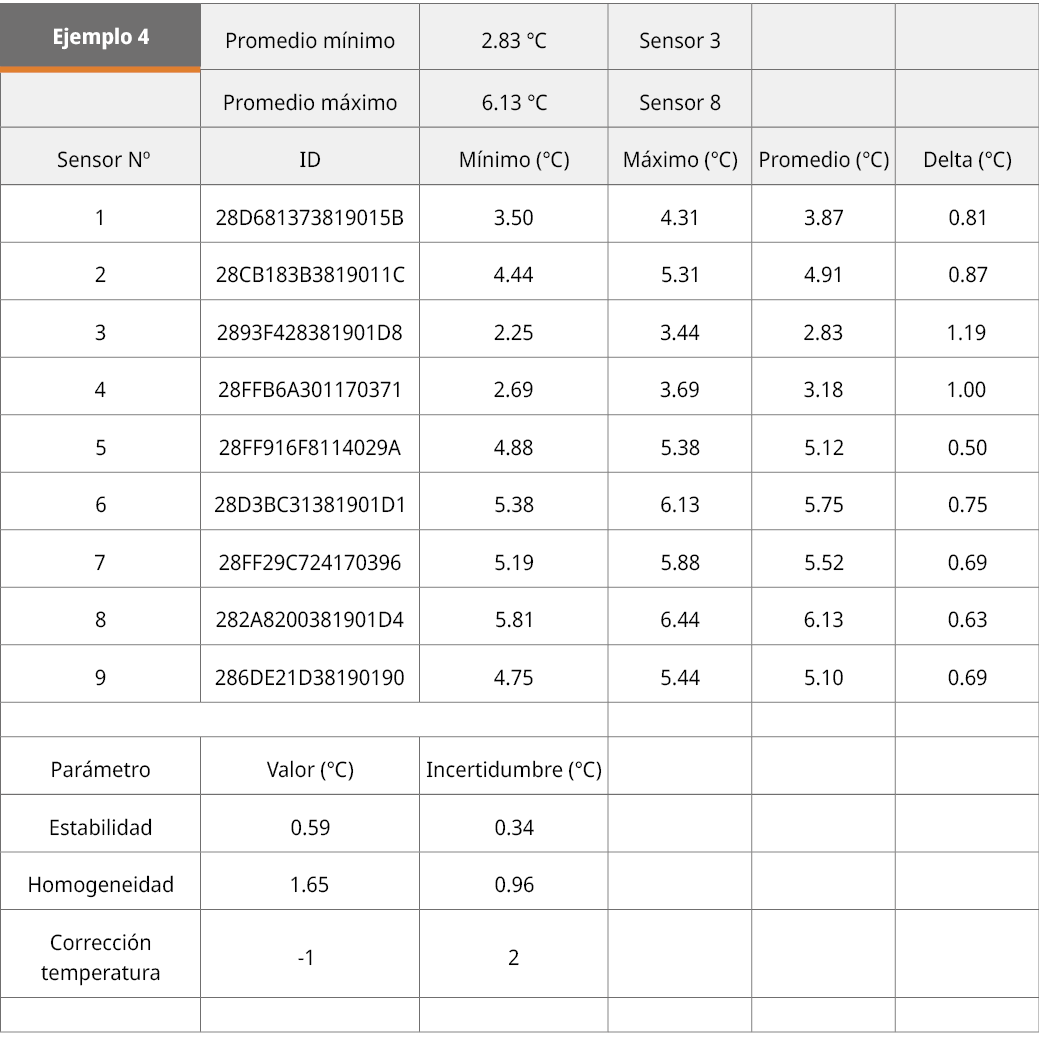 Como se puede apreciar en estos ejemplos, el dispositivo permitió caracterizar medios de variadas características en distintas condiciones de temperatura. Fue capaz de detectar las importantes variaciones de temperatura en los ejemplos 3 y 4, lo cual se refleja en el alto valor de homogeneidad. A su vez, se pudo evidenciar la distinta estabilidad de los medios 3 y 4 respecto a los 1 y 2, lo cual no es casual ya que el refrigerador es un modelo comercial, el horno de laboratorio del ejemplo 3 es de una marca de tercer orden, mientras que los ejemplos 1 y 2 son cámaras industriales de una marca de primera línea. Las incertidumbres alcanzadas (fuertemente relacionadas con las propiedades del medio a caracterizar) llegaron a ser considerablemente bajas (estabilidad, 0.04 ℃; homogeneidad, 0.14 ℃), reflejándose también en ellas el comportamiento de los medios caracterizados. Con equipos con una buena homogeneidad y estabilidad, se obtienen bajas incertidumbres. El instrumento responde adecuada y coherentemente al medio que está caracterizando.