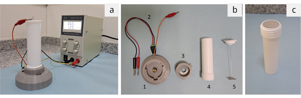 Figura 1. Imagen del sistema de electrodeposición, a) sistema de electrodeposición completo formado por la fuente de voltaje y la celda de electrodeposición; b) componentes del sistema de electrodeposición formado por: (1) base con conectores (2), (3) tapa inferior, (4) cuerpo de la celda de electrodeposición, (5) tapa/soporte del electrodo; c) Vista de la plancheta situada en la base de la celda.