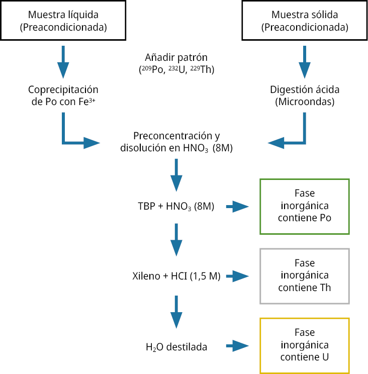 La separación y el aislamiento de los radionucleidos presentes en las muestras se realizó mediante la técnica de extracción líquido-líquido (Vera et al., 2002), empleando diferentes solventes como tributilfosfato (TBP), xileno + ácido clorhídrico (HCl, 37 % v/v) y agua tipo 1, para conseguir la separación secuencial de polonio, torio y uranio respectivamente (Holm y Fukai, 1977). En la Figura 2 se muestra un esquema del método de separación secuencial aplicado. La fracción de torio, a pesar de no ser de interés en este trabajo, debió ser separada porque algunas zonas de su espectro alfa podían solaparse al espectro alfa del uranio.